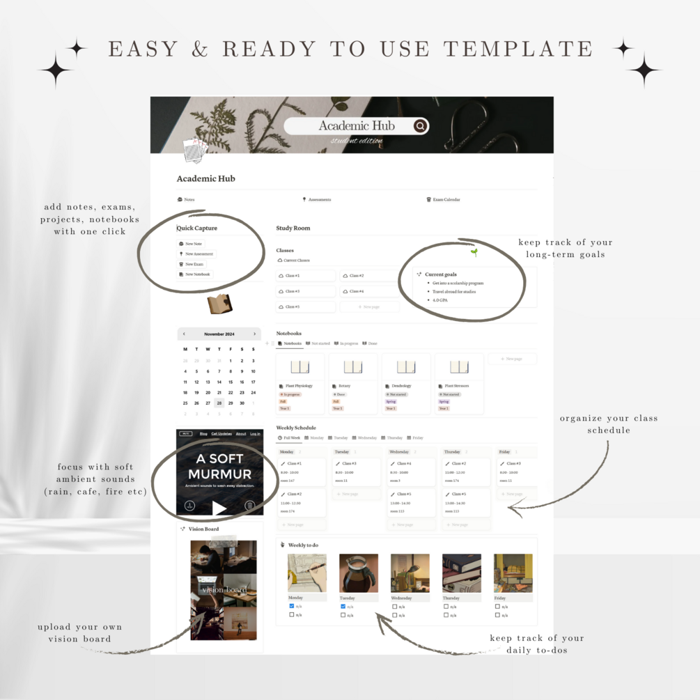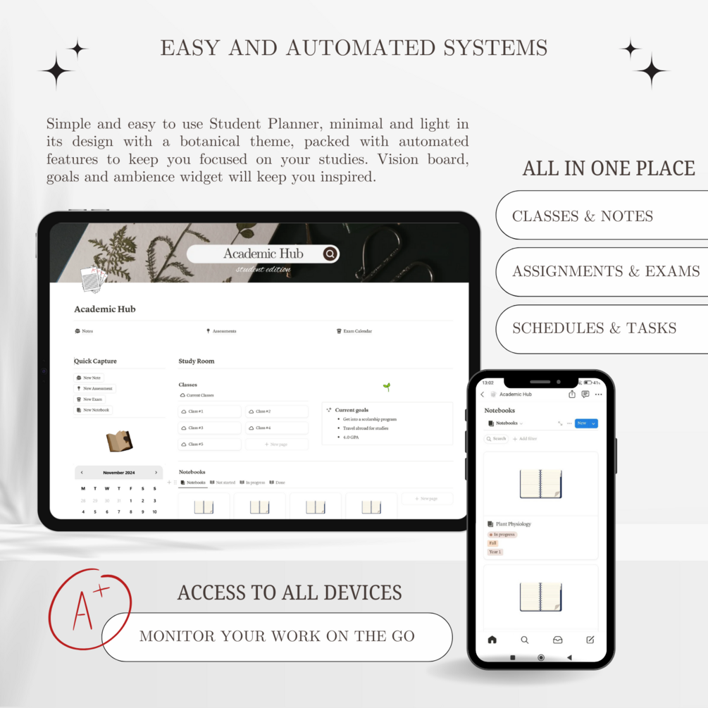 Notion University Botany Planner | Minimal Dark Academia Notion Template | Notebook, Student Planner, Assignment Tracker, Lessons & Exams Schedule